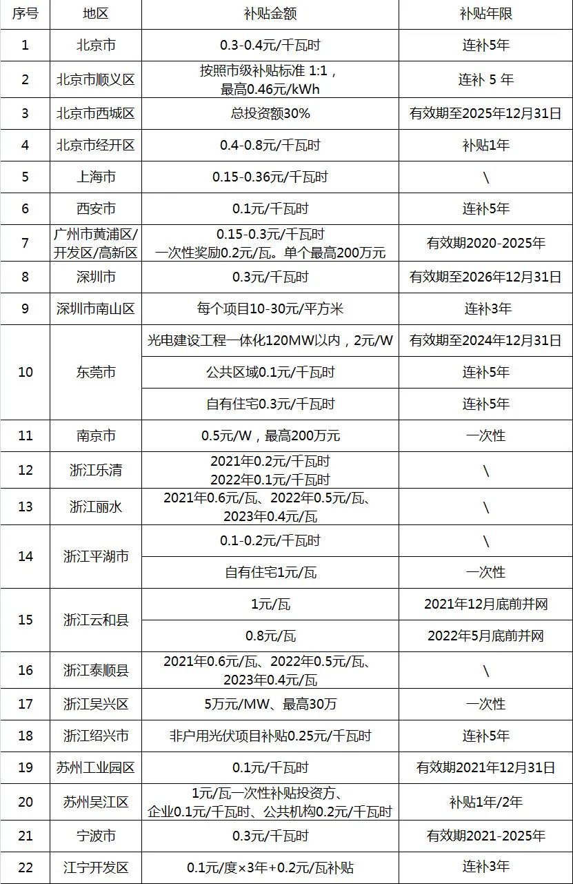 2022年還有22個(gè)地區(qū)有光伏補(bǔ)貼,要裝光伏得抓緊了,詳情如下表: