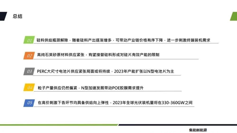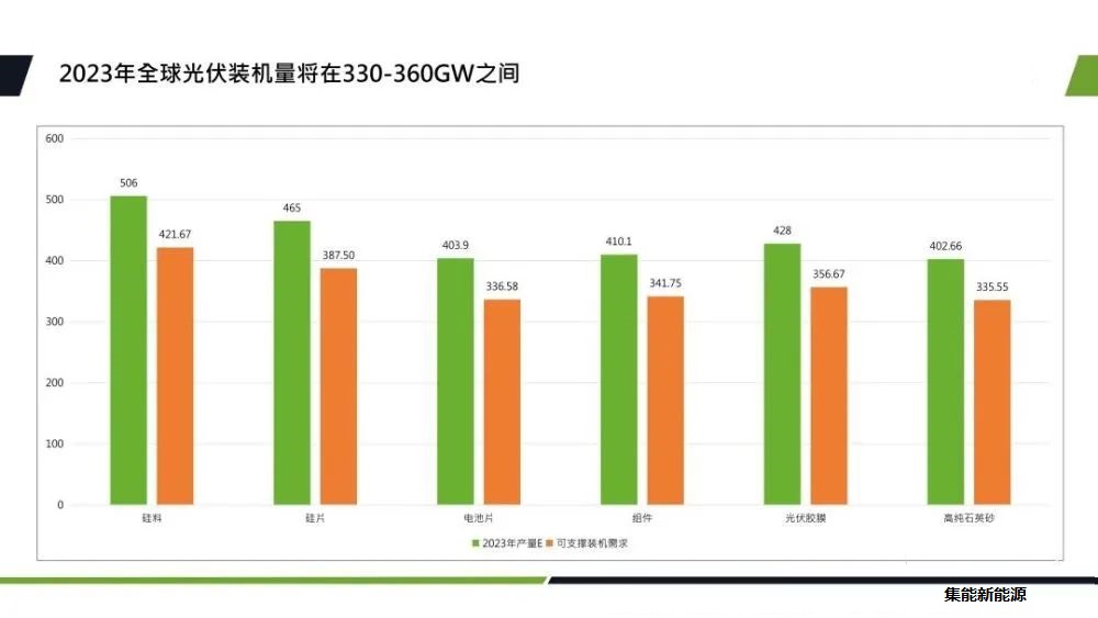主要從產(chǎn)業(yè)鏈各環(huán)節(jié)分析2023年的供需情況和技術(shù)進展。首先對產(chǎn)業(yè)鏈各環(huán)節(jié)2023年的市場量以及光伏裝機量進行預估,從數(shù)據(jù)上看,2023年硅料整體供應充足,不再是制約產(chǎn)業(yè)發(fā)展的瓶頸環(huán)節(jié)。硅片端因為高純石英砂的供應偏緊,從而造成了坩鍋產(chǎn)出的受限,這也將影響到硅片的實際產(chǎn)出。電池片環(huán)節(jié)因為2022年下半年以來,新建產(chǎn)能主要還是以n型技術(shù)為主,新技術(shù)產(chǎn)能釋放具有較大不確定性。PERC的產(chǎn)能擴張?zhí)幱谕顟B(tài),2023年大尺寸PERC電池片或?qū)⒊霈F(xiàn)供需緊平衡的狀態(tài)。主要還是關(guān)注TOPCon電池片的實際產(chǎn)出。膠膜方面,poe粒子目前主要還是依賴進口,隨著n型需求的提升,poe粒子的供應端也會較為緊張。但是以上各環(huán)節(jié)在較高的資金刺激下,實際產(chǎn)出都具備了向上的彈性。所以綜合的產(chǎn)業(yè)鏈的實際產(chǎn)出數(shù)據(jù),我們預計2023年全球裝機量將在330-360GW之間。