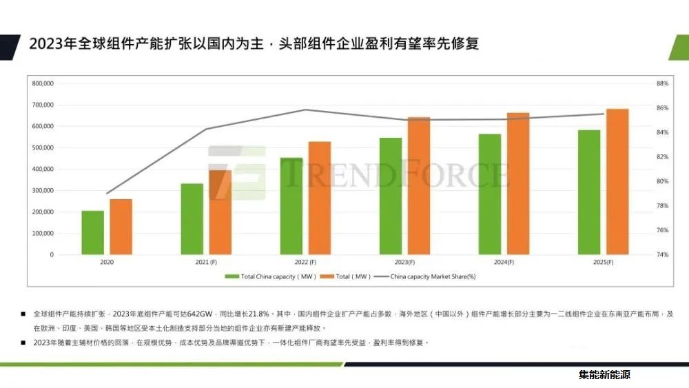 組件環(huán)節(jié)。全球組件產(chǎn)能也在持續(xù)的擴張,2023年底組件產(chǎn)能達642GW,同比增長了21.8%。其中國內(nèi)組件企業(yè)擴產(chǎn)產(chǎn)能占多數(shù),海外地區(qū)產(chǎn)能增長主要是國內(nèi)一、二線類企業(yè)在東南亞的產(chǎn)能布局。還有像歐洲、印度、美國、韓國等地受本土化支持,部分當?shù)氐慕M件企業(yè)也有新建產(chǎn)能釋放。2023年,隨著在規(guī)模優(yōu)勢、成本優(yōu)勢以及品牌渠道優(yōu)勢,一體化組件廠商有望率先受益,盈利得到修復。