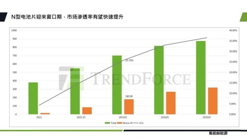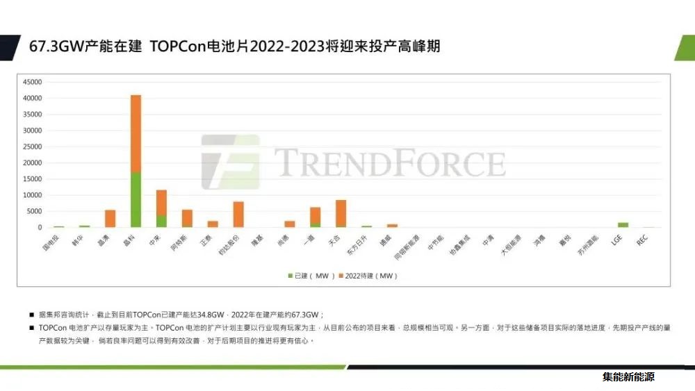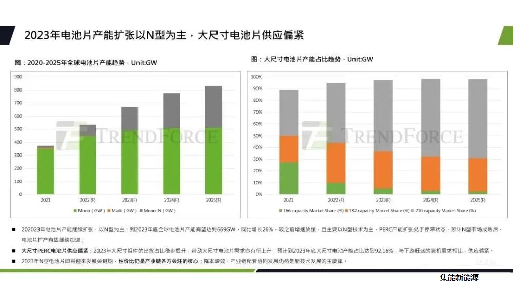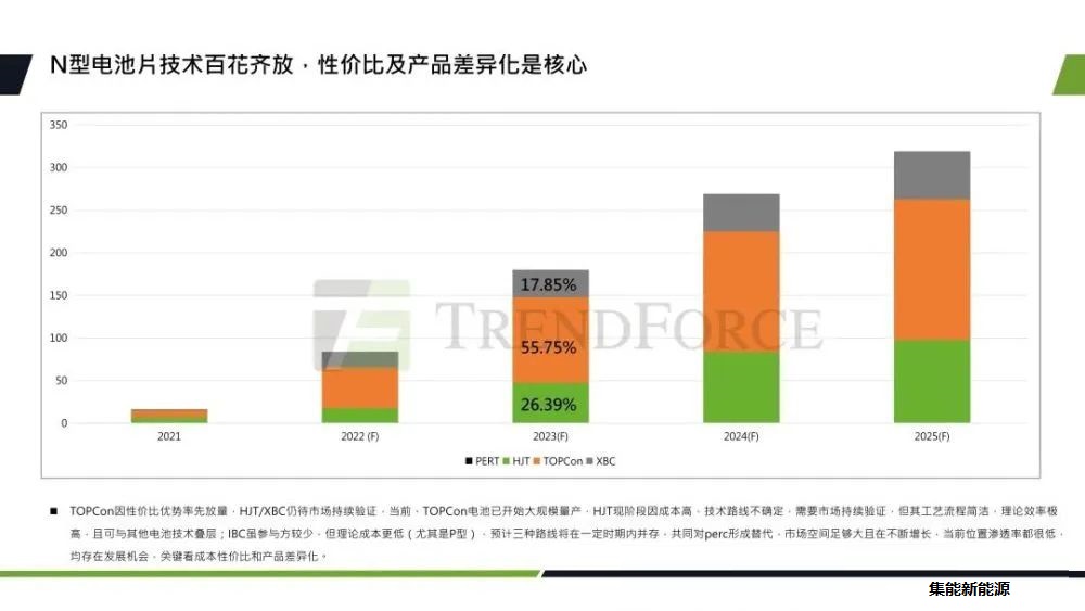 TOPCon因為它的性價比優(yōu)勢,實現(xiàn)了率先放量。預計到2023年底,N型電池片的產(chǎn)能將達到180GW,占比約為25.7%。