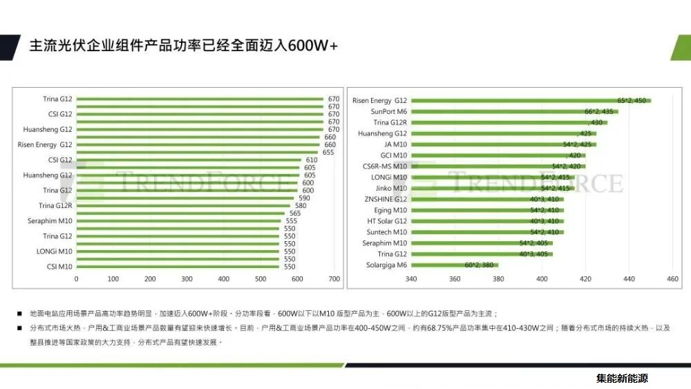 目前主流光伏企業(yè)組件產(chǎn)品功率已邁入了600W+,分功率段來看,600W以下以M10版型產(chǎn)品為主,600W以上的主要以G12版型產(chǎn)品為主。產(chǎn)品數(shù)量有望快速增長,目前來看,戶用及工商業(yè)場景產(chǎn)品功率大多在400到450W之間。隨著分布式市場的持續(xù)火熱,和整縣推進國家政策的大力支持,分布式產(chǎn)品有望快速發(fā)展。