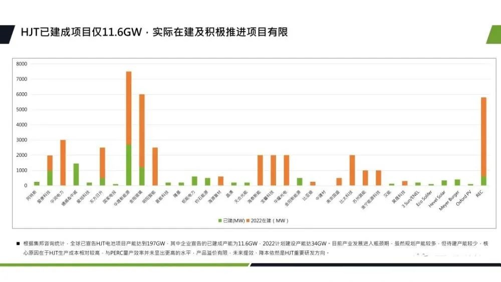 再來具體看一下HJT技術(shù)產(chǎn)能進展及效率方面。目前HJT技術(shù)發(fā)展進入瓶頸期,全球企業(yè)宣告的已建成產(chǎn)能為11.6GW。雖然規(guī)劃的產(chǎn)能比較多,但是待建的產(chǎn)能還是比較少的。核心原因還是因為當前HJT的生產(chǎn)成本相對較高,與PERC量產(chǎn)效率并未顯出更高水平,產(chǎn)品溢價有限。
