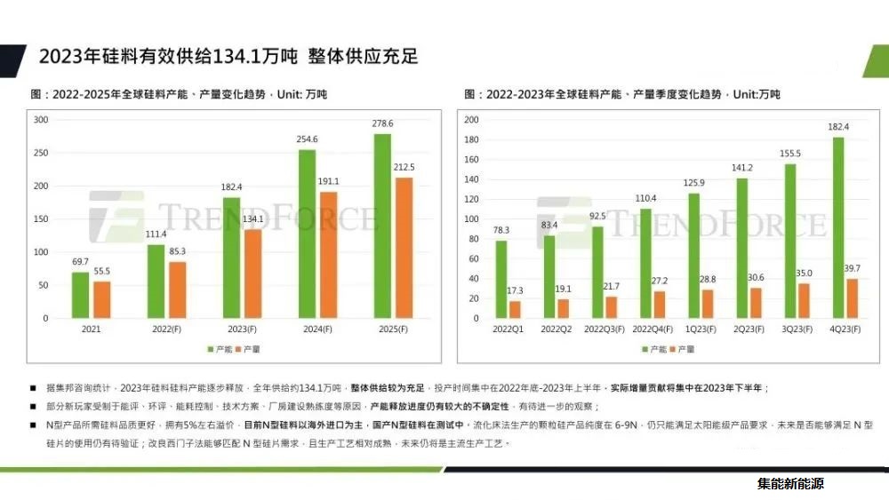 各環(huán)節(jié)2023產(chǎn)能供給情況和技術(shù)進展情況。首先是硅料環(huán)節(jié),隨著硅料產(chǎn)能的逐步釋放,2023年硅料的有效供給大約是134萬噸,可支撐375GW以上的裝機,大約是505GW的組件產(chǎn)出,整體供應比較充足,新增產(chǎn)能集中在2023年的下半年。在需求強勁的情況下,2023年上半年硅料的供應將處于偏緊的情況。部分新玩家受制于環(huán)評、能評、技術(shù)方案的原因,產(chǎn)能釋放進度具有較大的不確定性,n型產(chǎn)品的發(fā)展也拉升了n型硅料的需求,目前n型硅料還是以海外進口為主,流化床法生產(chǎn)的顆粒硅產(chǎn)品純度還是只能滿足太陽能級產(chǎn)品的需求,是否能滿足n型硅片的產(chǎn)能還有待驗證。但是改良的西門子法能夠完全滿足n型硅片的需求,而且它的生產(chǎn)工藝相對成熟,未來仍是主流生產(chǎn)工藝。