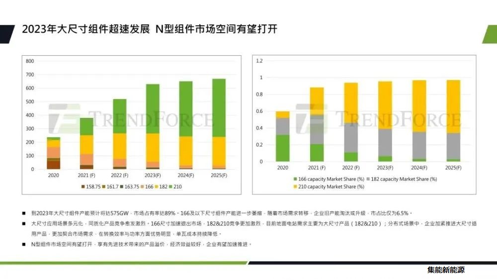 <p font-size:17px;text-align:justify;background-color:#ffffff;"="" style="margin: 0px; padding: 0px; list-style-type: none; font-family: "Microsoft YaHei"; text-align: justify; background-color: rgb(255, 255, 255); color: rgb(34, 34, 34);">到2023年大尺寸組件產(chǎn)能預計575GW,市場占有率達89%,166及以下尺寸組件產(chǎn)品進一步萎縮,隨著市場需求轉(zhuǎn)移,企業(yè)舊產(chǎn)能淘汰升級,166市占比僅為6.5%。大尺寸應用場景多元化,地面電站的應用主要以大尺寸為主,在分布式中企業(yè)也在推進大尺寸的應用,以適應市場需求。N型組件因為享有技術(shù)帶來的產(chǎn)品溢價,經(jīng)濟效益較好,企業(yè)有望加速推進。