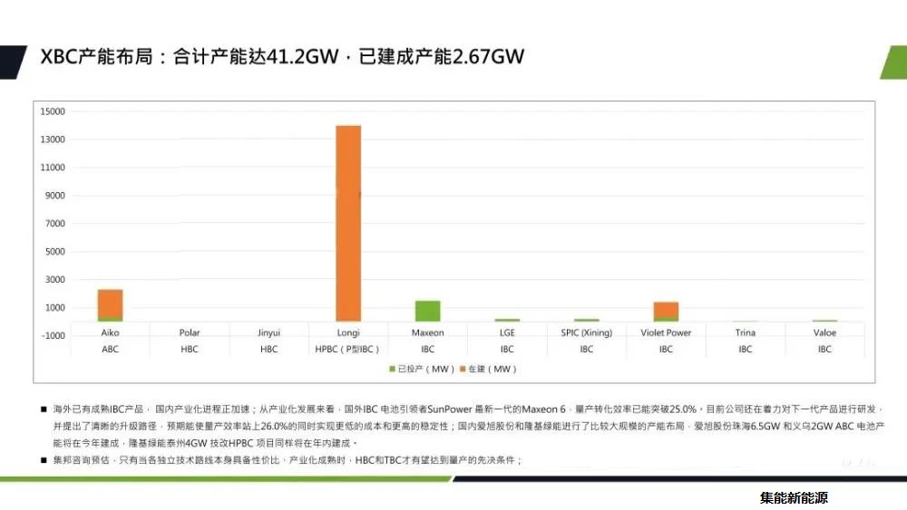 再來看一下新技術(shù)中XBC電池方面。XBC電池可以分為經(jīng)典的IBC電池、PVC電池以及HBC電池。經(jīng)典的IBC電池可以采用P型硅片或者N型硅片,此外還可以與TOPCON電池進行結(jié)合,形成了PVC電池,與HJT電池結(jié)合形成HBC電池,兼具兩者的優(yōu)點,實現(xiàn)更高轉(zhuǎn)換效率。目前XBC的合計產(chǎn)能達到41.2GW,已建成的產(chǎn)能大約是2.67GW。從產(chǎn)業(yè)化發(fā)展來看,目前海外有成熟的IBC產(chǎn)品,國內(nèi)產(chǎn)業(yè)化進程也正在加速。國外IBC電池的引領(lǐng)者SunPower新一代的Maxeon6,它的量產(chǎn)轉(zhuǎn)化效率已經(jīng)突破25%。國內(nèi)愛旭和隆基都進行了比較大規(guī)模的產(chǎn)能布局,有些產(chǎn)能也將在今年年底建成。目前IBC及HJT的生產(chǎn)成本還比較高,只有當各自的獨立技術(shù)路線本身具備了性價比,以及產(chǎn)業(yè)化成熟的時候,HBC和IBC才有望達到進一步的發(fā)展。