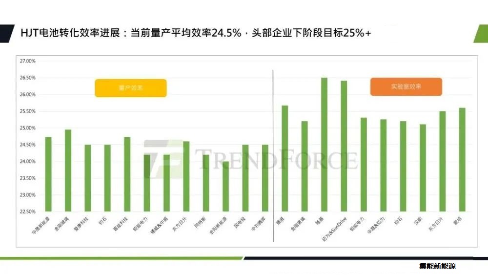 從實驗室效率來看,HJT技術(shù)的電池轉(zhuǎn)換效率已經(jīng)實現(xiàn)了25%的突破,今年更是將******紀錄刷新到了26.5%。近期邁為采用的雙面微晶設(shè)備使HJT電池的轉(zhuǎn)換效率達到了26.41%,在量產(chǎn)效率方面,目前國內(nèi)多家企業(yè)都可以實現(xiàn)24.5%以上的平均量產(chǎn)轉(zhuǎn)換效率,隨著設(shè)備的不斷升級以及雙面微晶技術(shù)的量產(chǎn),2022年HJT有望實現(xiàn)量產(chǎn)效率25%的突破。