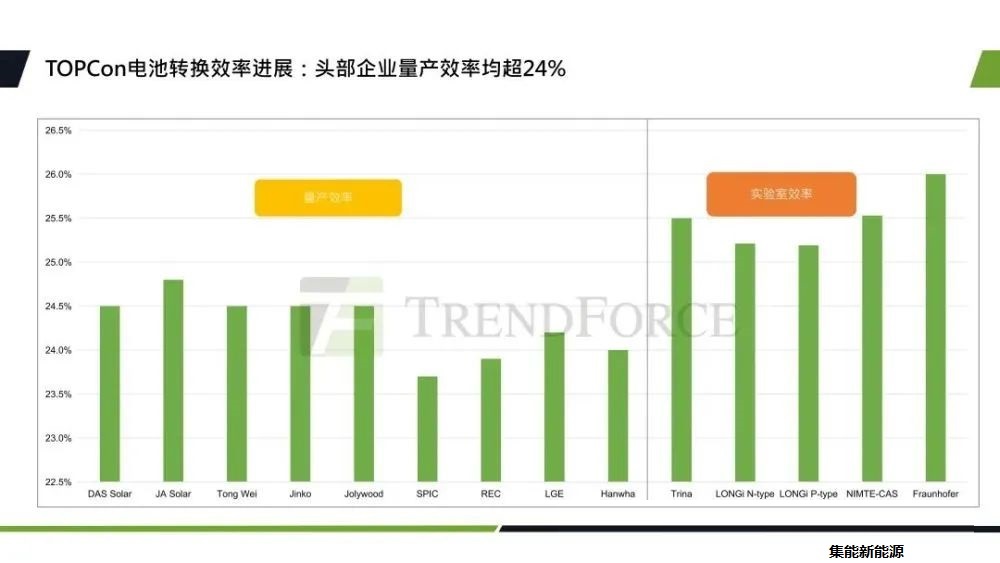 當前,TOPCon頭部企業(yè)的量產(chǎn)效率都突破了24%,比PERC平均要高0.5%-0.8%,2023年的量產(chǎn)效率也有望朝著24.5%-25%邁進。TOPCon的實驗室轉(zhuǎn)換效率目前都超過了25%,今年的四月份晶科公布了182版型的n型TOPCon電池片的轉(zhuǎn)換效率,已經(jīng)達到了25.7%,打破新的記錄。