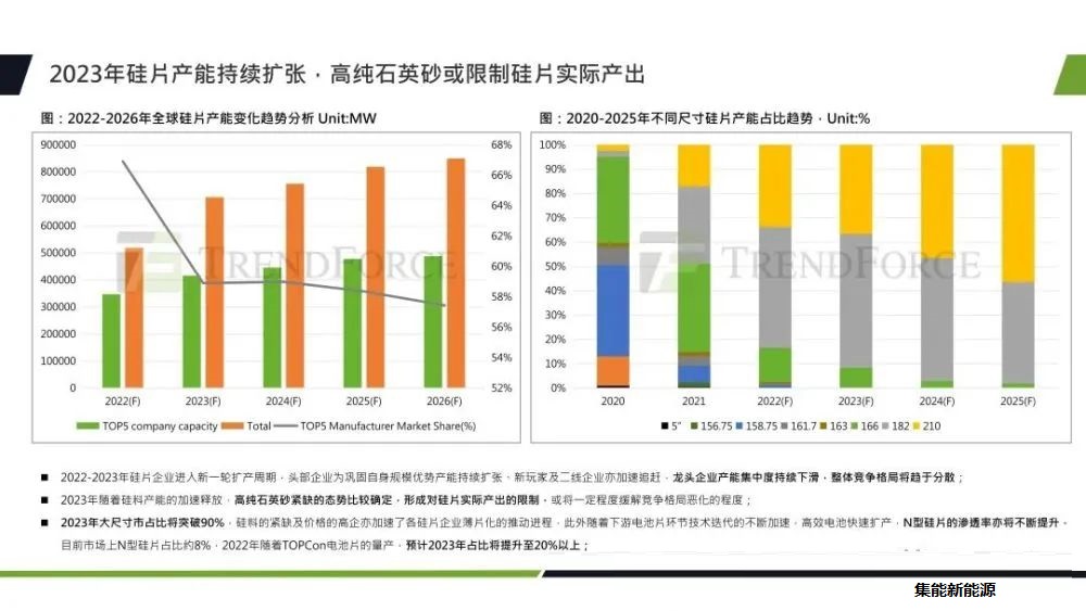 接下來是硅片的產(chǎn)能以及技術(shù)方向。2023年,硅片企業(yè)進入了新一輪的擴產(chǎn)周期,頭部企業(yè)為了保護自身規(guī)模優(yōu)勢,產(chǎn)能在持續(xù)擴張。新玩家以及二線企業(yè)也在持續(xù)的擴張產(chǎn)能,龍頭企業(yè)的產(chǎn)能集中度在持續(xù)的下滑,整體行業(yè)的競爭格局趨于分散。在硅片生產(chǎn)環(huán)節(jié)中需要用到的坩鍋材料、高純石英砂緊缺的態(tài)勢也是比較確定的,這也將對硅片的實際產(chǎn)出形成限制。但這也在一定程度上緩解了硅片競爭格局的惡化。大尺寸及薄片化也是比較確定的,2023年大尺寸市占比將突破90%,硅料的緊缺以及價格高企加速了各硅片企業(yè)薄片化的推動進程。此外,隨著下游電池片環(huán)節(jié)技術(shù)迭代的不斷加速,n型硅片的滲透率也將不斷提升,目前,n型硅片的總體產(chǎn)量還比較低,占比大約是在8%左右。隨著TOPCon電池片的量產(chǎn),預計2023年占比將提升至20%以上。
