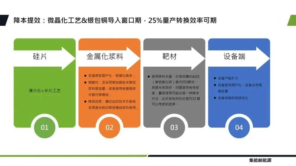 目前HJT技術(shù)降本增效的路徑還是比較確定的,硅片端主要是薄片化以及半片工藝的發(fā)展,金屬化漿料方面,包括低溫銀漿的國產(chǎn)化、規(guī)?;当?銀包銅、電鍍銅上降低銀漿的耗量,靶材價格以及用量的下降,還有設(shè)備國產(chǎn)化、規(guī)?;当镜确矫妗?/span>